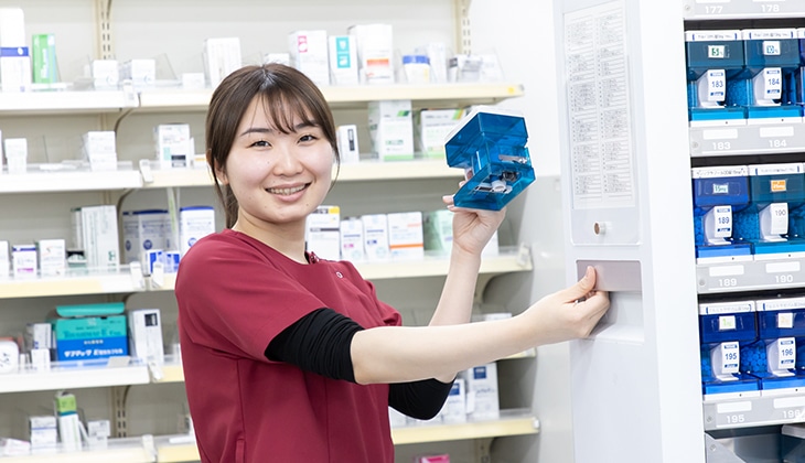 入職前はプリセプター(新人1人に先輩薬剤師が1人つく)制度ではないことに不安がありましたが、今となってはプリセプター制ではないからこその、誰にでも質問できるこの環境にとても助けられています。独り立ちするまでは毎日必ずサポートの先輩がついてくれて、わからないことはすぐに聞くことができ、また専門的なことが聞きたければ、その分野の資格をもっている先輩に詳しく教えてもらうこともできるため、とても勉強になります。