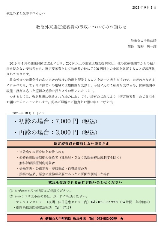 救急外来選定療養費の徴収についてのお知らせ 2025年09月19日 お知らせ 救急外来選定療養費の徴収についてのお知らせ ■開始日 2025 年10月1日 8:40〜 ■時間:診療日8:40〜16:30 選定療養費についてはコチラを参照されてください。 一覧を見る